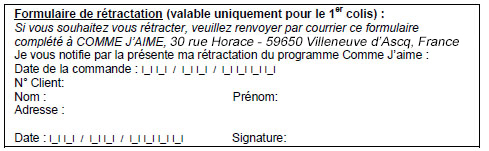 Le Client dispose d'un délai de 14 jours à compter de la réception du 1er colis pour se rétracter sans motif en adressant le formulaire de rétractation ci-après ou un papier libre dénué d’ambiguïté au Service Client à l’adresse indiquée ci-dessous ; le Client devra retourner son colis dans ce cas à la même adresse, sans retard excessif et au plus tard 14 jours à compter du jour où COMME J’AIME est informée de la décision de rétractation. Les frais de port du retour du colis restent à la charge du Client. Pour être remboursé du montant de sa Commande, le client doit retourner son colis ainsi que le cas échéant les produits gratuits dans un état neuf, chacun des coffrets/conditionnements contenant les repas de la semaine ne devant pas avoir été détériorés. COMME J’AIME procèdera au remboursement soit par virement bancaire, soit par chèque dans un délai maximal de 14 jours à compter de la réception du colis retourné ou jusqu'à ce que le consommateur ait fourni une preuve de l'expédition de ces biens, la date retenue étant celle du premier de ces faits.